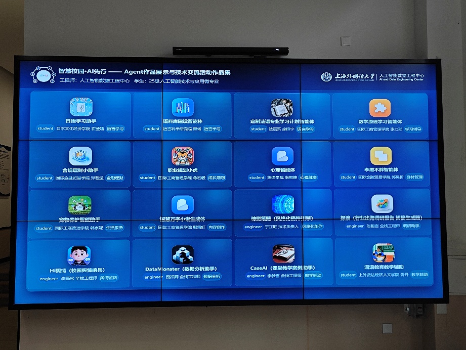 开幕式现场,来自人工智能数据工程中心的AI工程师与“人工智能技术与应用”微专业学生共同研发的18件作品集中亮相,涵盖语言类(语料库建设、法语专业定制化学习等)、生活类(身材管理、心理健康等)、调研类(行业出海调研报告等)等多个领域,充分展现了我校师生在AI应用领域的创新活力。