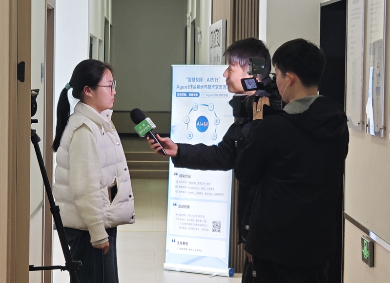 26日,上海教育电视台记者团队走进活动现场,对参展师生进行了深度采访。镜头前,学生们分享了参与智能体活动的真实感受,讲述了从最初的好奇观望、带着疑问探索,到现场亲眼见证学校师生作品实际水平的认知转变过程。这一环节不仅记录了上外学子的创新风采,更将学校“AI+”教育改革的成果推向了更广泛的社会视野。