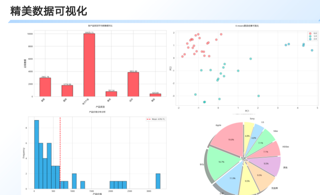 该智能体具备端到端的自动化数据处理引擎:在数据准备阶段,自动识别数值型与分类型字段,智能处理缺失值插补与异常值检测;在分析阶段,生成全维度描述性统计(均值、中位数、标准差、分布偏度等),并基于数据特征自动匹配最优可视化方案——从基础柱状图、饼图到进阶的箱线图、相关性热力图、PCA降维散点图全覆盖;在建模阶段,集成K-means聚类算法实现客户价值分层,并运用随机森林模型量化特征重要性,精准定位所探究问题的核心驱动因素。